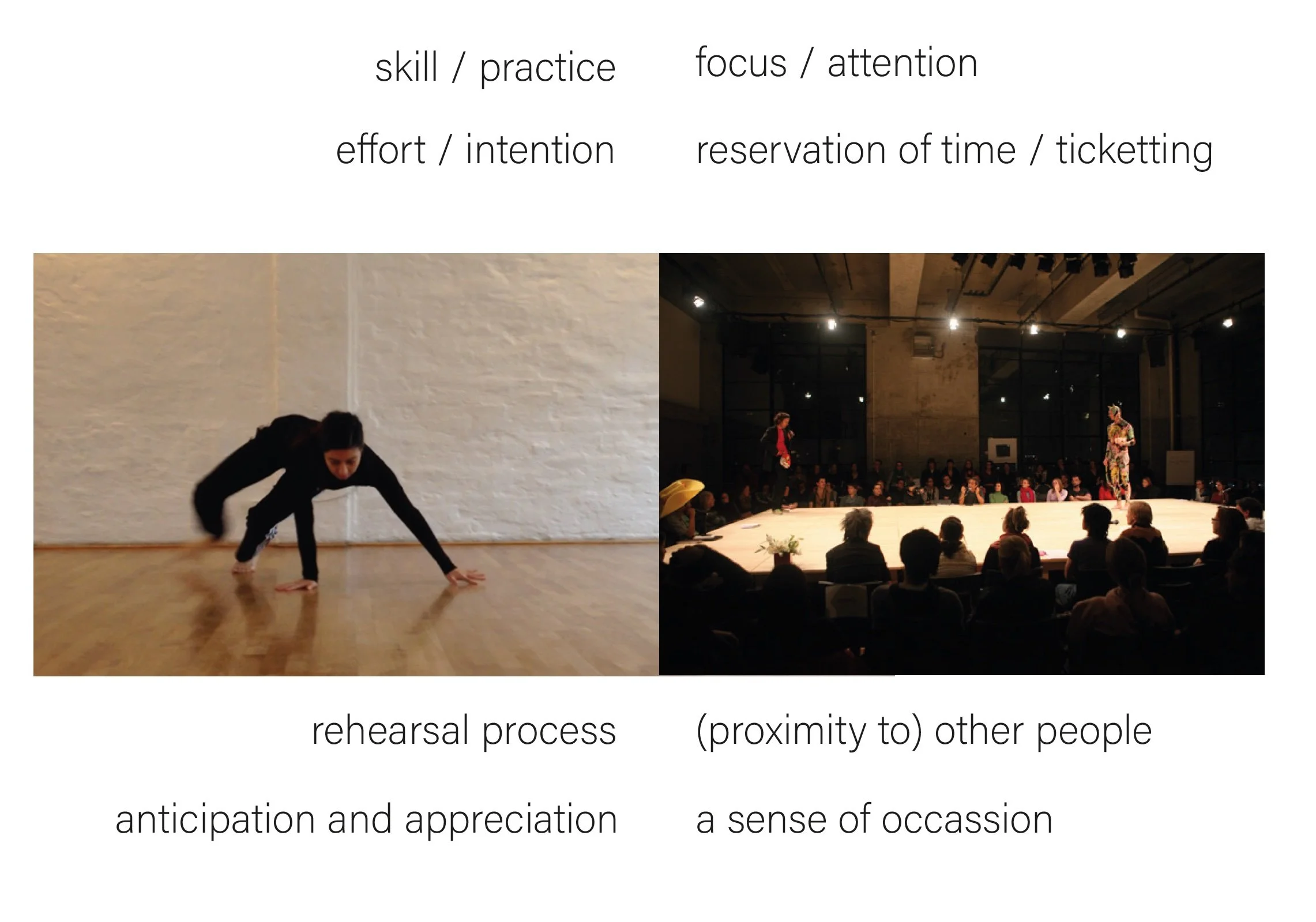 In grappling with these questions, I devised four categories which seemed of particular importance and general relevance. For the maker and performer: (1) effort/intention, (2) practice/skills, (3) rehearsal processes, and (4) anticipation and appreciation. For the audience or member of the public: (1) proximity to other bodies, (2) ticketing/reservation of time, (3) focus/attention, and (4) a sense of occassion.